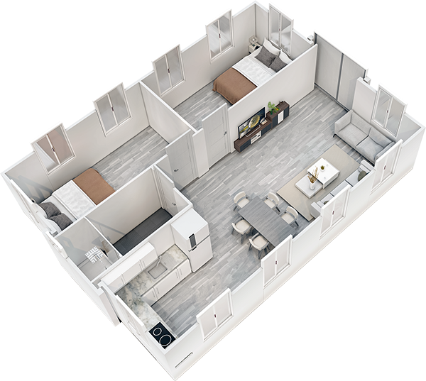 The floor plans of our Premium Space Cabins offer a comfortable and relaxed living experience while maximising the use of space and natural light. We have 4 unique floor plan options with 1, 2, 3, and 4 bedrooms, living space, kitchenette, and bathroom with shower + toilet.